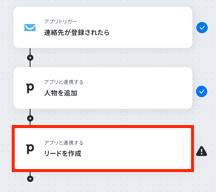 - 最後に、オペレーションでPipedriveの「リードを作成する」アクションを設定し、前のステップで追加した人物情報と関連付けてリードを作成します。