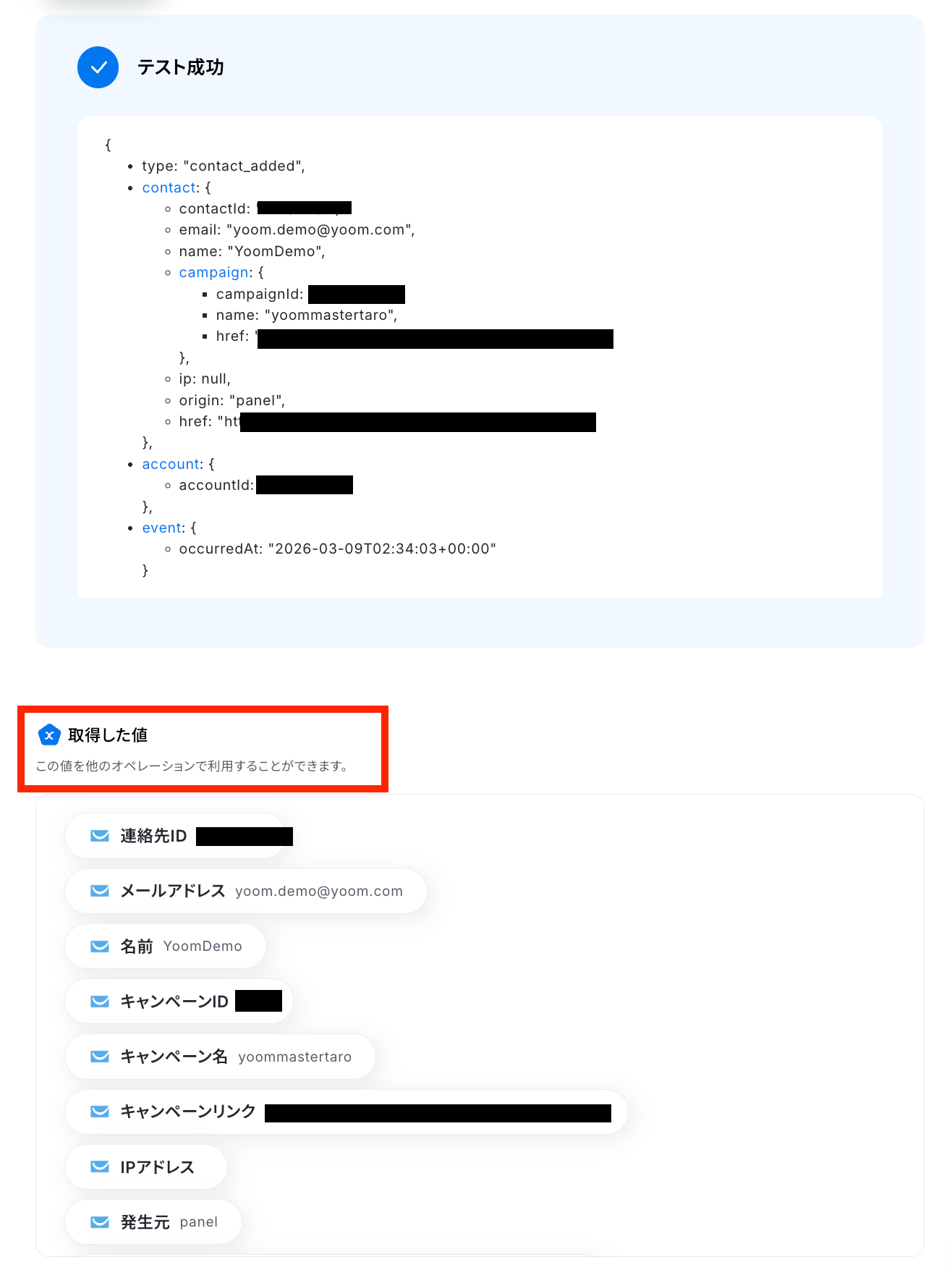 テスト成功で、取得した値が取得されます。