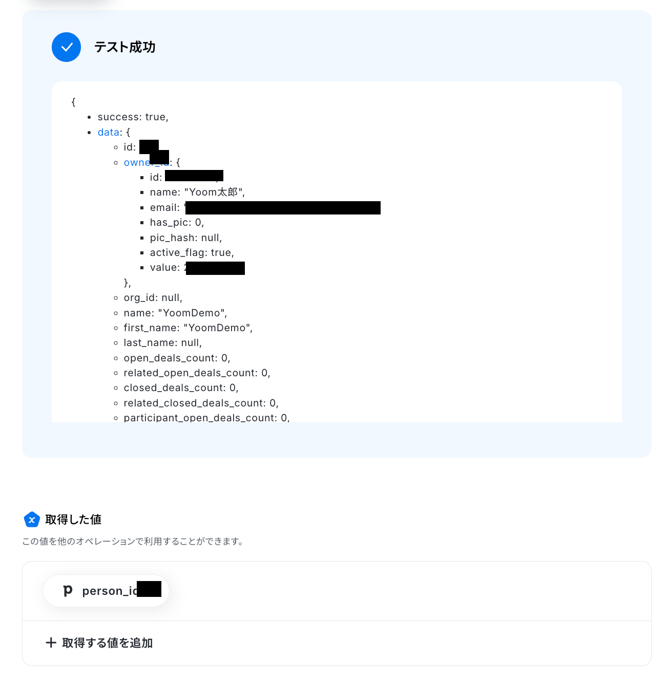 GetResponseから取得した値を利用して、Pipedrive上で人物を追加する設定を行います。