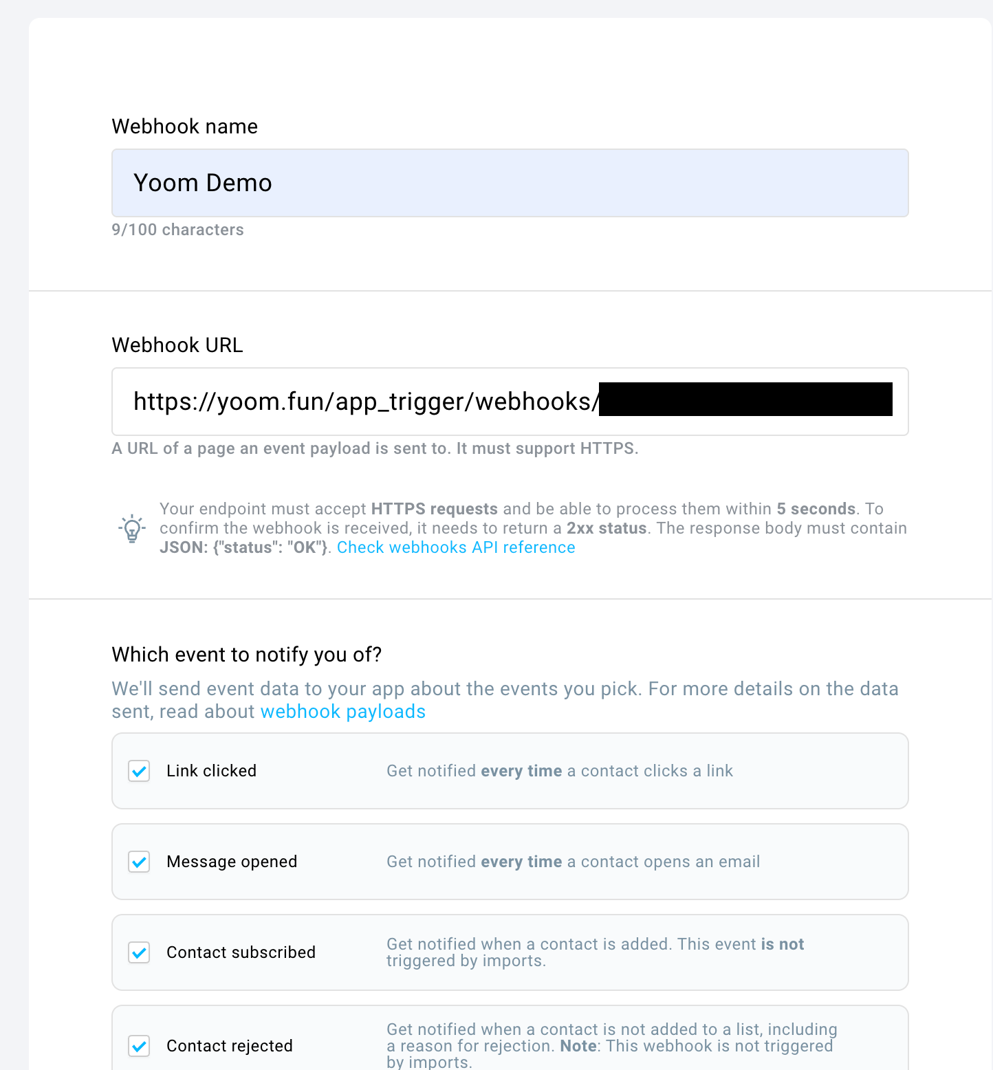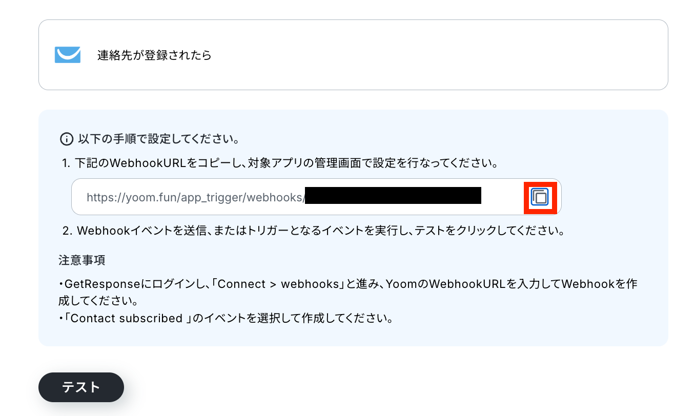 Webhookを登録しましょう!赤枠をクリックしてURLをコピーしたら、注意事項にしたがってGetResponses上でWebhookを登録します。