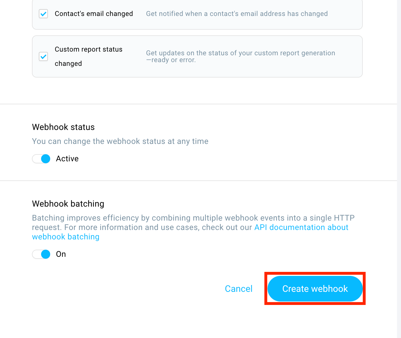 Webhookが反応する対象のイベントを選択して、ステータスを「Active」にしてから「Create Webhook」をクリックします。