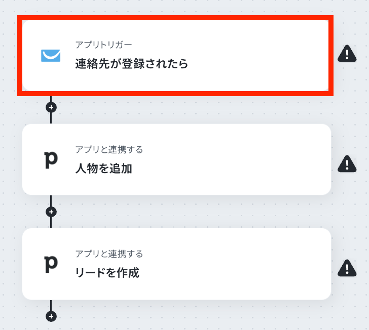 トリガーとなるアプリの設定を行っていきます。最初の赤枠をクリックしてください!