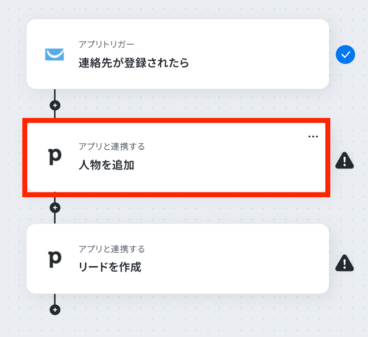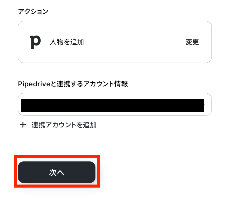 - 最後に、オペレーションでPipedriveの「人物を追加」アクションを設定し、新しい人物情報を登録します。