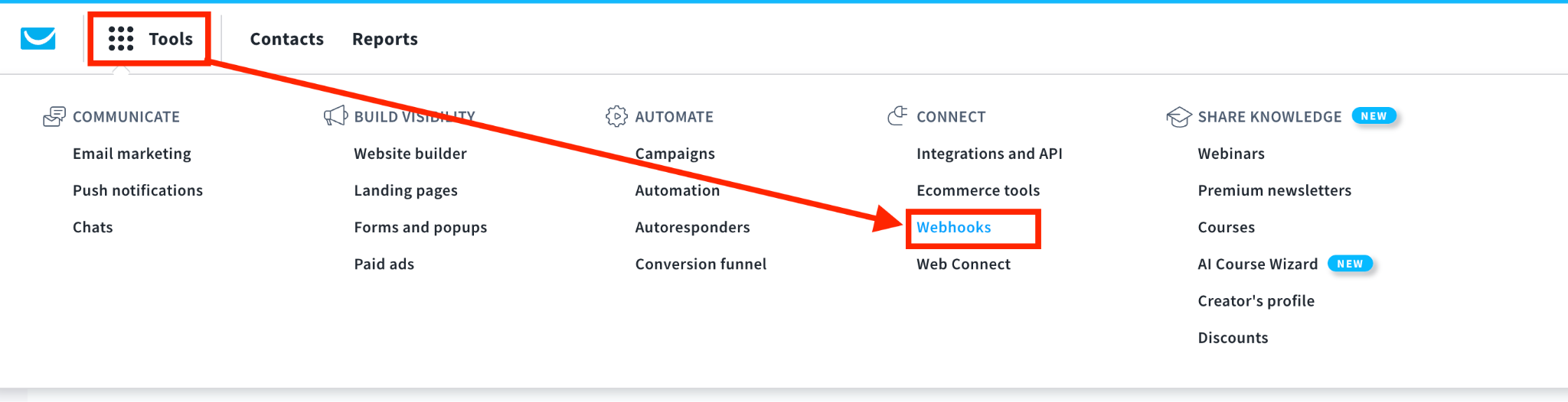 GetResponsesにログインしたら、ToolsからWebhooksを選択します。