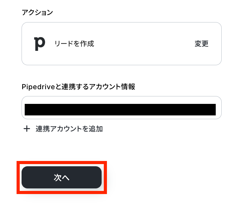 Pipedriveにリードを作成する設定を行います。最後の赤枠をクリックしましょう!