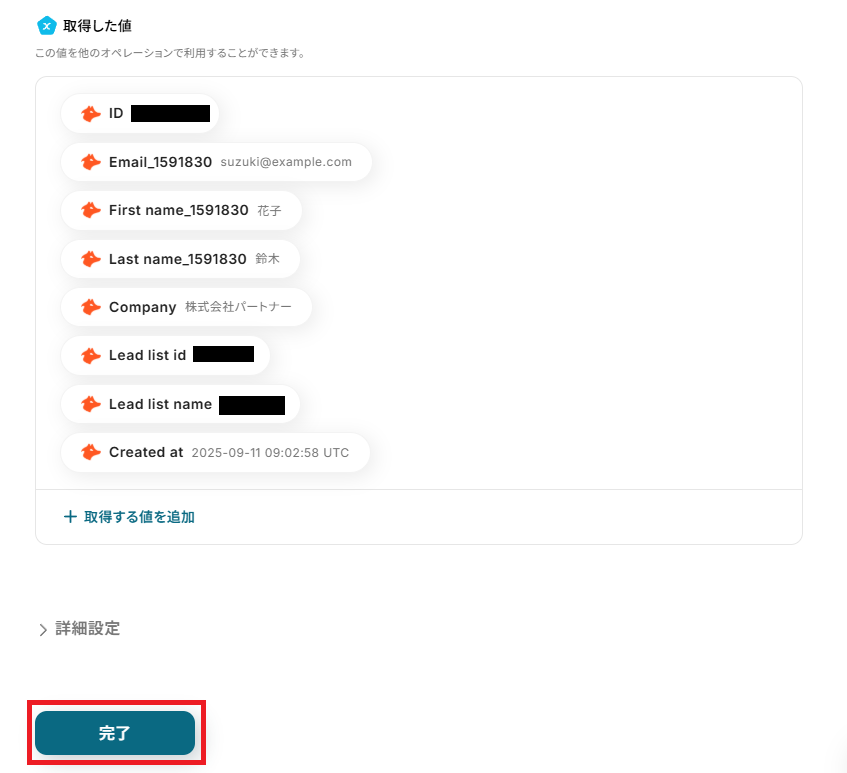 Hunterにあらかじめ設定してあるカスタムフィールドが候補として出てくるため任意の項目を選択し、「Value」に任意の値を設定することで、カスタムフィールドにも連携が可能です。