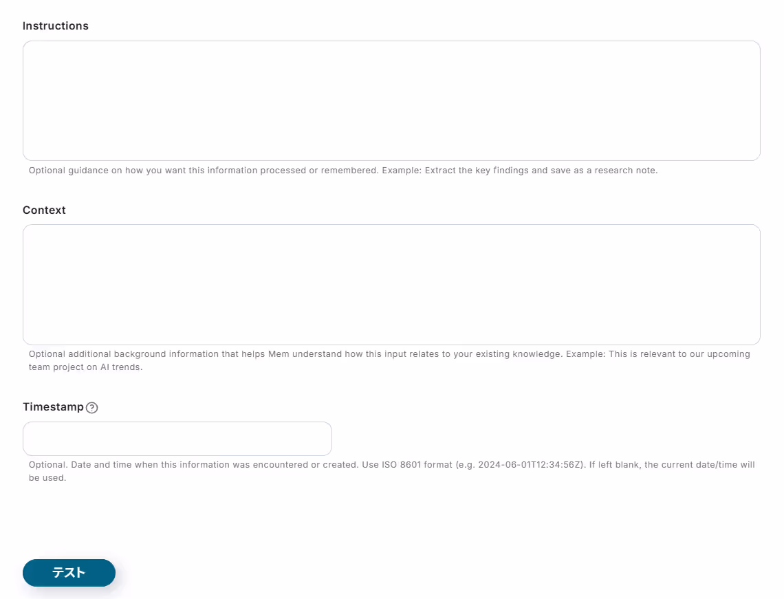 設定完了後は「テスト」を行い、Memへ実際に追加されることを確認してみましょう。