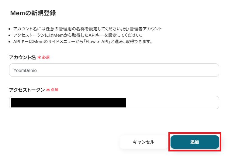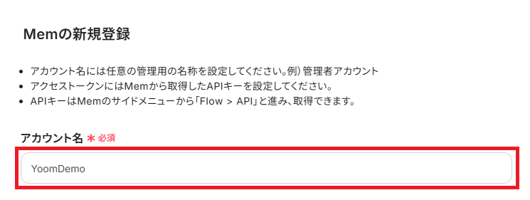 Memにログインし、「Integrations > API> Add new API key」と進み、生成されたAPIトークンを「アクセストークン」に設定してください。