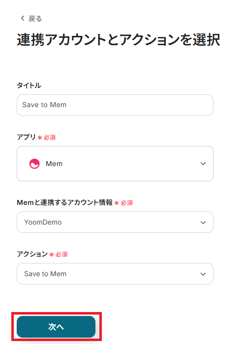 Memと連携するアカウントに間違いがないかを確認し、「次へ」をクリックしましょう。