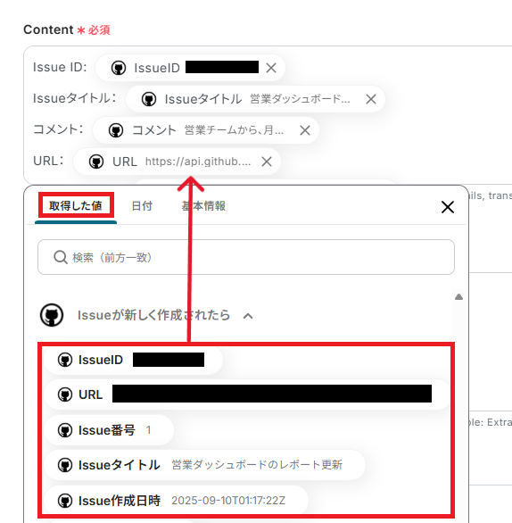 「Content」は、入力欄をクリックして表示される取得した値から選択してください。