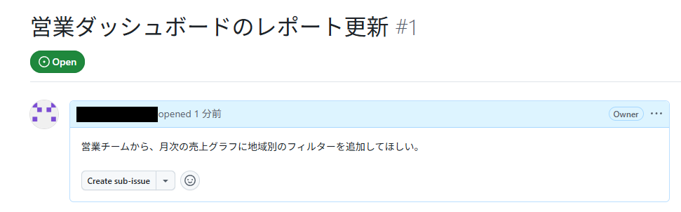 ・オーナー名:「https://github.com/{オーナー名}/{リポジトリ名}/issues/{Issue番号}」のオーナー名の箇所をコピーペーストします。