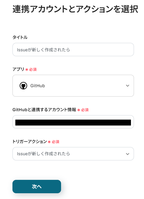 タイトルと連携するアカウント情報を任意で設定し、トリガーアクションはテンプレート通りに「Issueが新しく作成されたら」のまま「次へ」をクリックして進んでください。