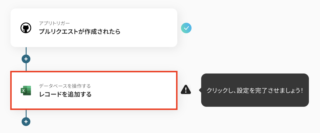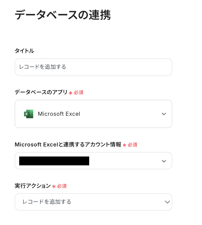 ※「追加するレコードの値」は、連携しているMicrosoft Excelのデータベースに紐づいて表示されています。項目を編集したい場合は、データベース側を編集してください。
