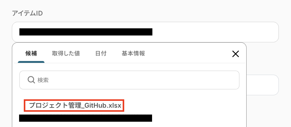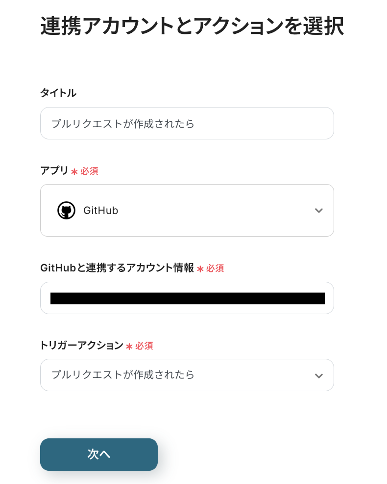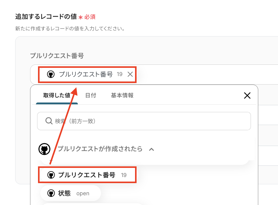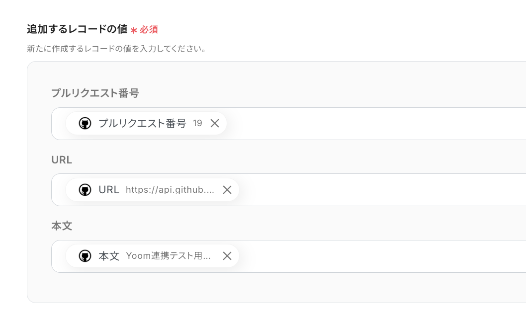 たとえば、「プルリクエスト番号」には「取得した値」の「プルリクエストが作成されたら」内にある「プルリクエスト番号」を設定します。