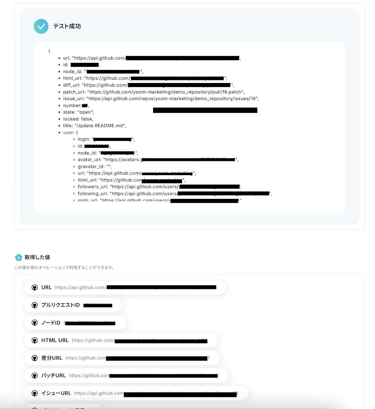 テストが成功すると、先ほど作成したプルリクエストの情報が「取得した値」として抽出されるので、内容を確認してくださいね!
