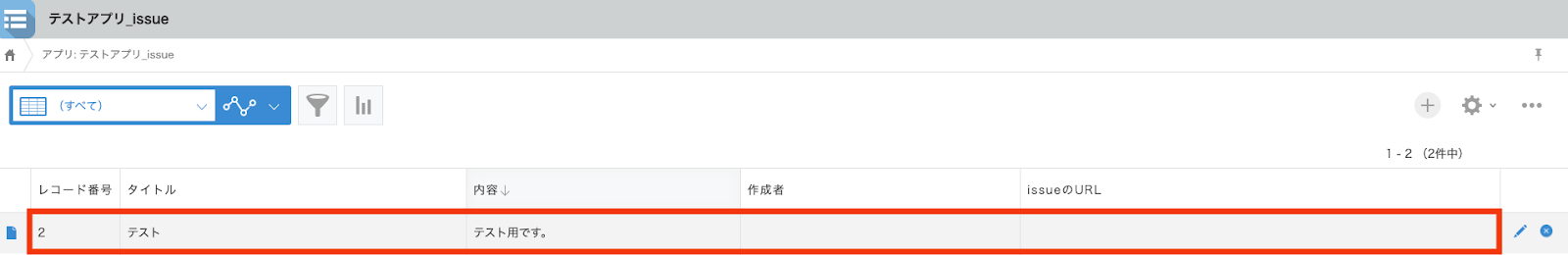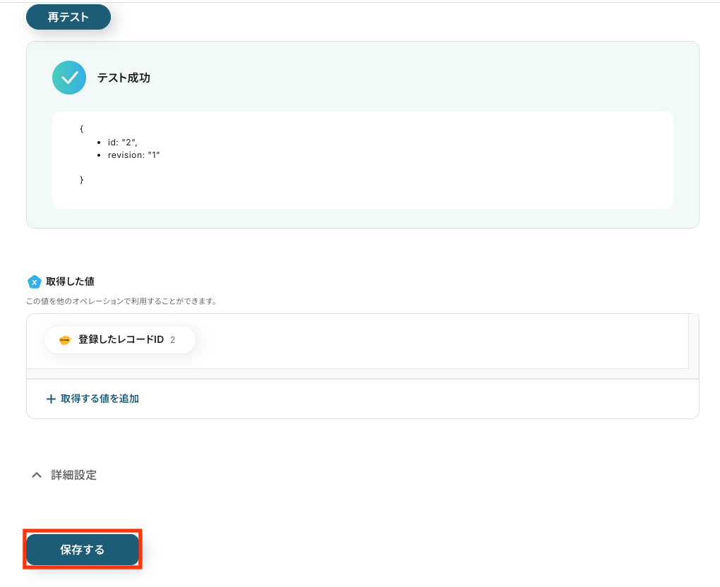 テストが成功すると、画面上部に「テスト成功」と表示され、作成されたレコードのIDが確認できます。 実際にkintoneのアプリ画面を開き、レコードが正しく追加されているか確認してみましょう。 問題がなければ、「保存する」をクリックして設定を完了します。