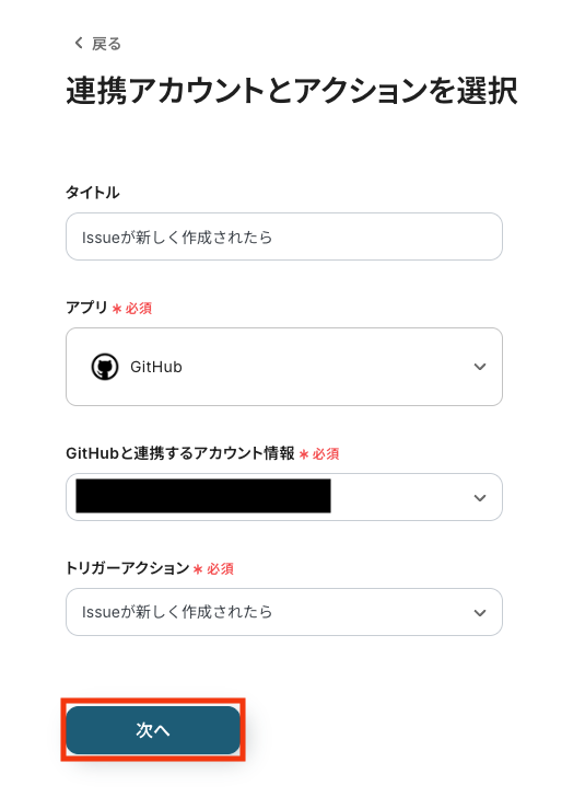 GitHubと連携するアカウントを選び、トリガーアクション「Issueが新しく作成されたら」を選択して「次へ」をクリックします。