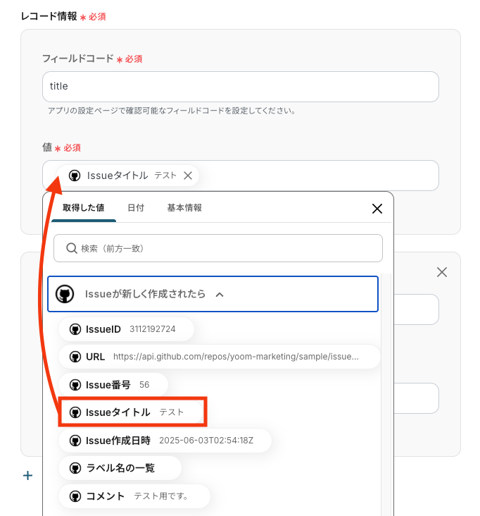 kintoneアプリの各フィールドに、GitHubから取得したデータを割り当てて設定します。 事前にkintoneのアプリ設定画面でフィールドコードを確認し、使用したい項目のコードを入力しておきましょう。 「値」の欄をクリックすると、取得済みのデータ項目が一覧で表示されるので、登録したいデータを選んで割り当ててください。 すべての入力が完了したら、「テスト」をクリックして、データが正しくkintoneに登録されるかを確認します。