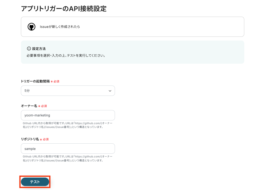 入力が終わったら、GitHubとYoomが正しく接続できる状態かどうかを確認するため、「テスト」をクリックします。
