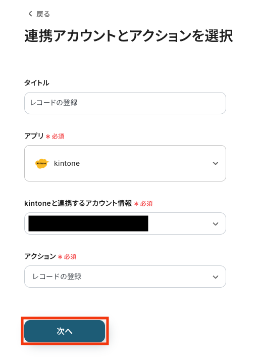 kintoneと連携するアカウント情報を選び、「レコードの登録」をアクションとして設定します。 すべて入力したら「次へ」をクリックします。