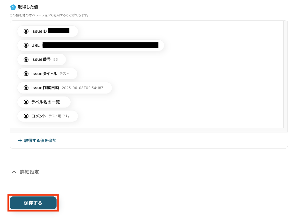 テストが成功すると、GitHubから取得できたIssueの内容が『取得した値』に表示されます。※ 取得した値とは? 内容に問題がなければ「保存する」をクリックしてトリガー設定を完了します。