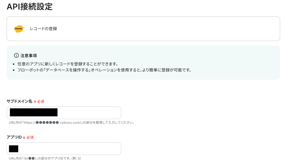 kintoneと連携するために、サブドメイン名とアプリIDを入力します。