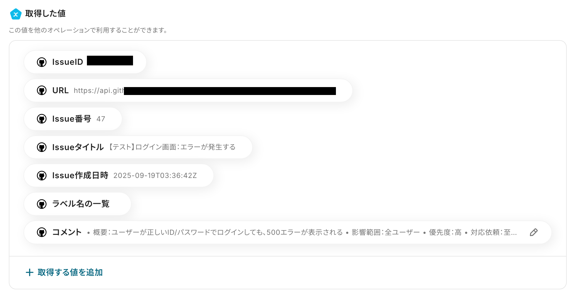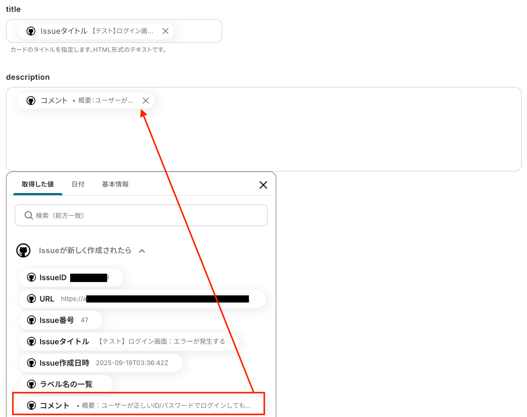 「title」「description」 :入力欄をクリックして表示される『取得した値』を設定してください。 取得値を利用することで、フローボットが起動するたびにGitHubのIssue情報を取得してMiroに反映します。 直接入力した内容は固定値となるのでご注意ください。 取得した値と固定値を組み合わせて設定することも可能です。