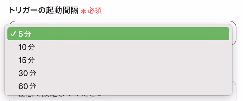 まずは、「トリガーの起動間隔」を5分・10分・15分・30分・60分から選択します。