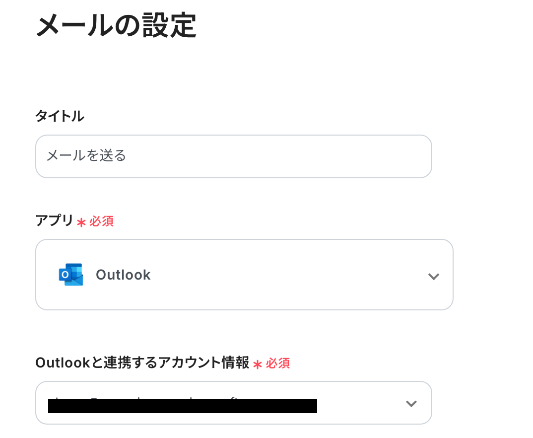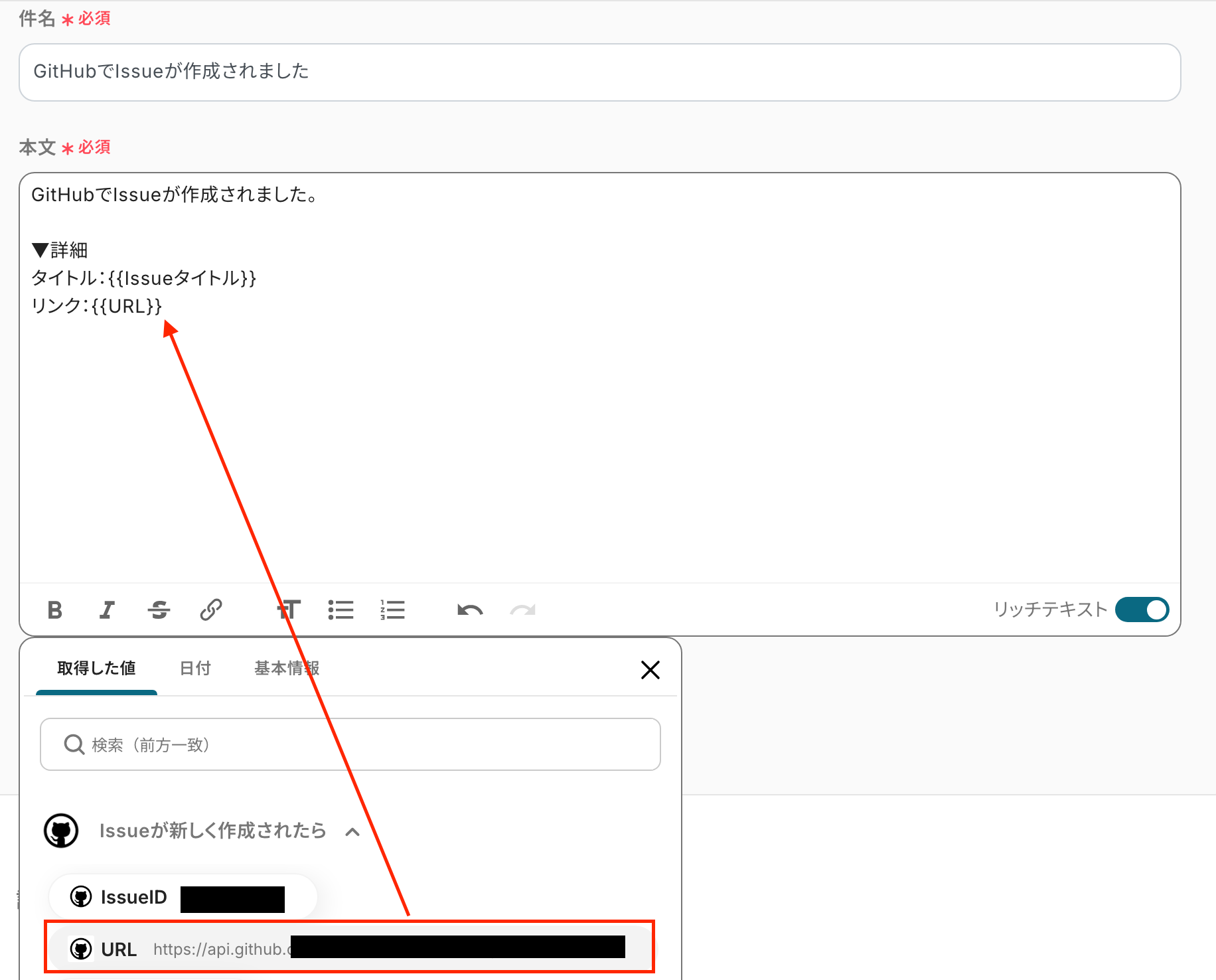 次に「件名」 と「本文」 を入力します。 入力欄をクリックして表示される『取得した値』を利用できます。 直接入力した値は固定値になり、毎回同じ内容がメールに反映されるのでご注意ください。