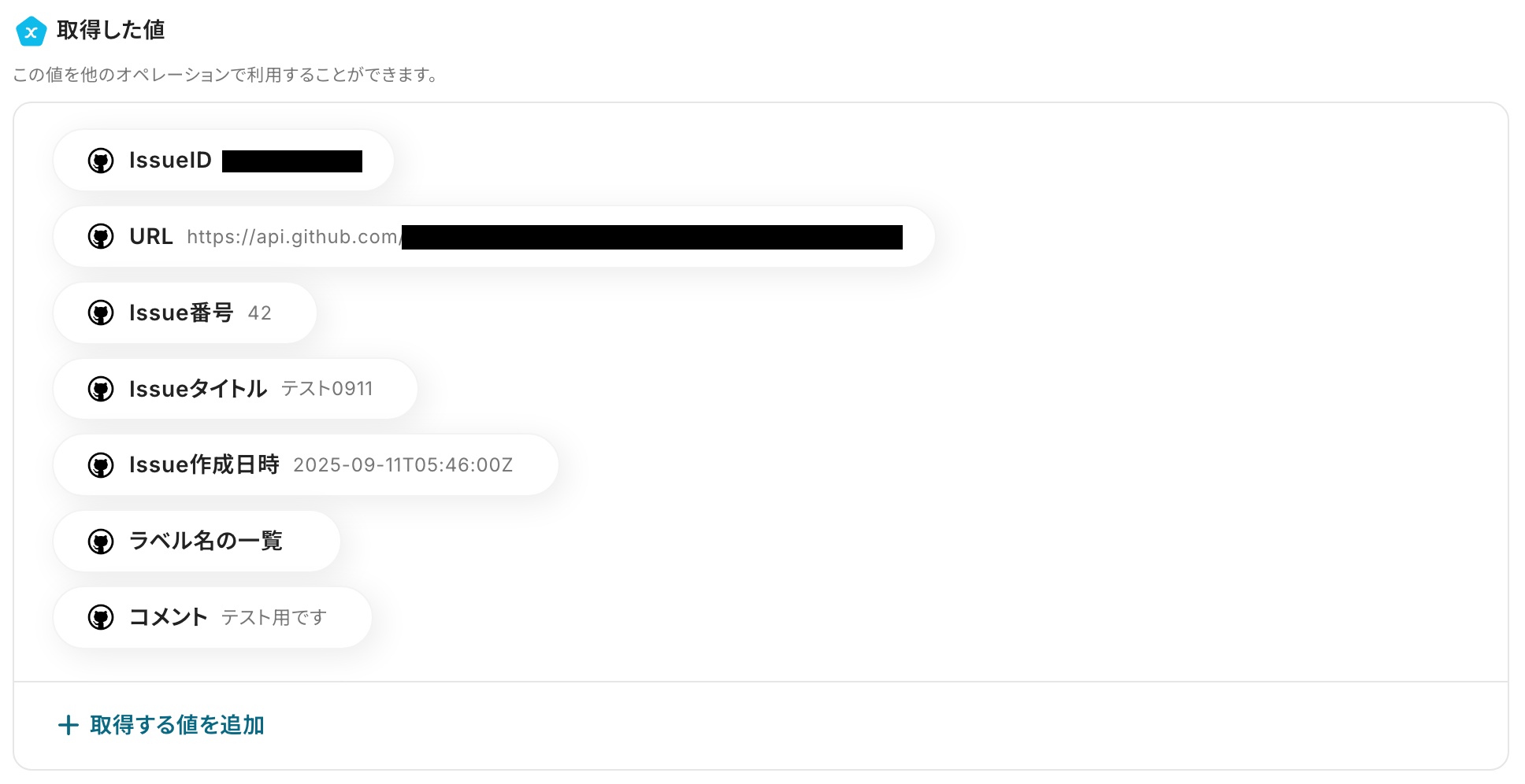 入力が完了したら、GitHubにIssueを作成します。 作成後、「テスト」をクリックしましょう! テストに成功したら、『取得した値 』を確認してください。