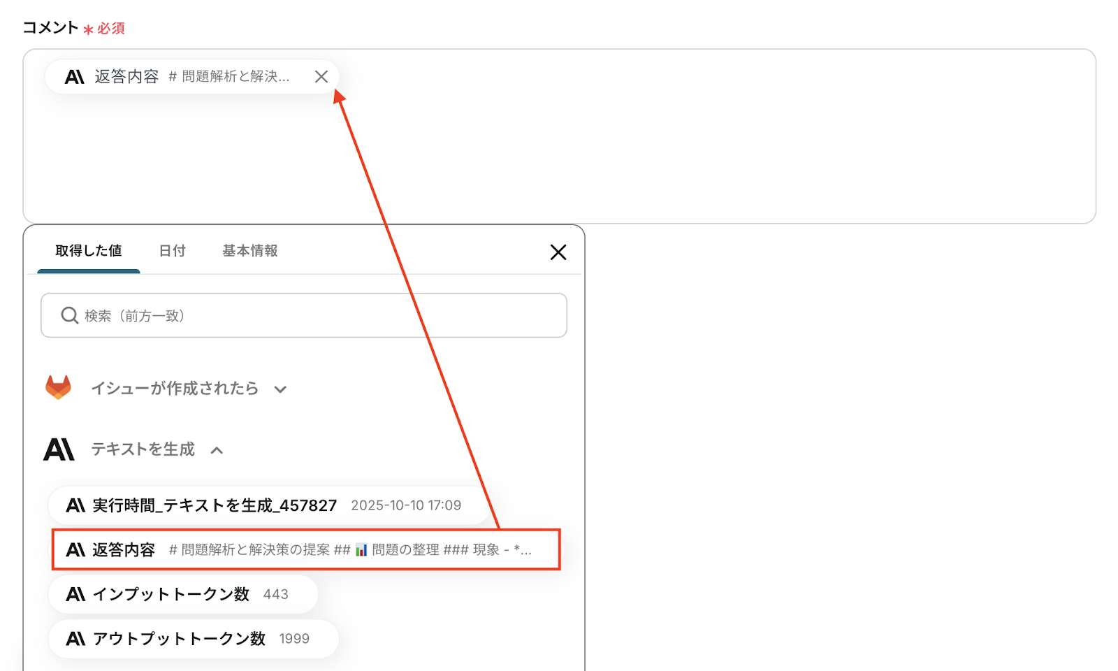 content 生成するテキストの内容を設定します。 入力欄をクリックすると、前のステップでGitLabから取得した値が表示されるので、選択して入力しましょう。 取得した値を活用することで値が固定化されず、フローボットを起動するたびに最新の情報を自動で反映できます。 画像のようにプロンプトとなるテキスト(固定値)と取得した値(変数)を組み合わせて作成することで、イシューの内容に応じた解析結果を生成することができます。