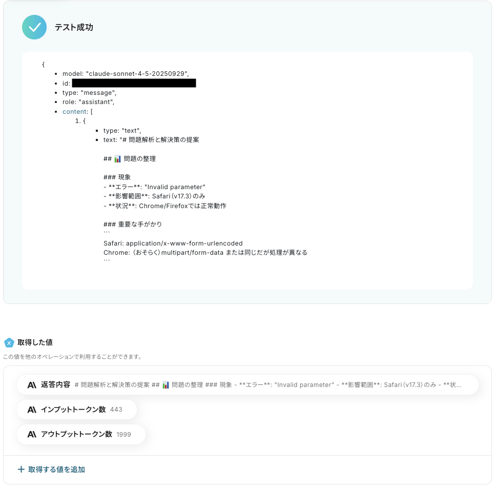 テストに成功すると、生成されたテキストに関する情報が一覧で表示されます。 以下の画像の取得した値を利用して、GitLabでイシューの更新が可能です。
