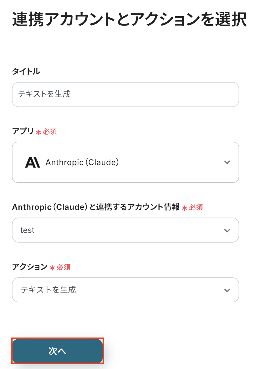 Anthropic(Claude)と連携するアカウント情報に問題がなければ、「次へ」をクリックします。