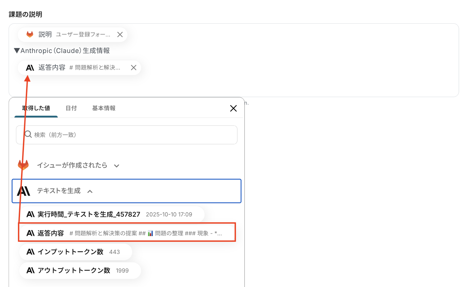 課題の説明 こちらもイシューIIDと同様に、入力欄をクリックするとGitLabとAnthropic(Claude)から取得した値が表示されるので選択して入力が可能です。 取得した値を活用することで値が固定化されず、フローボットを起動するたびに最新の情報を自動で反映できます。なお、テキストを直接入力した部分は固定値とされるため、取得した値を活用せず設定を行うと毎回同じ内容のイシューがGitLabで更新されてしまうので注意が必要です。
