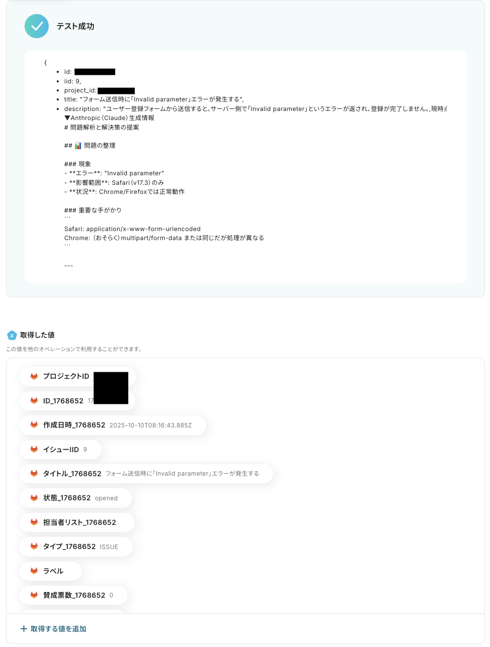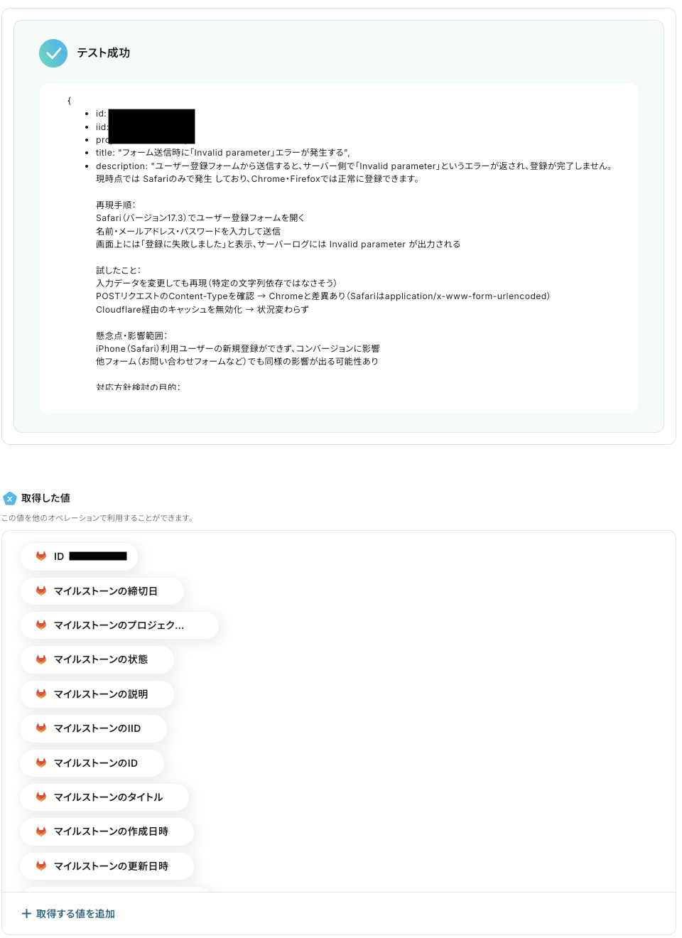 テストに成功すると下記の通り、GitLabに作成されたイシューに関する情報が表示されます。 以下の画像に表示されている取得した値は、この後のステップで利用できます。