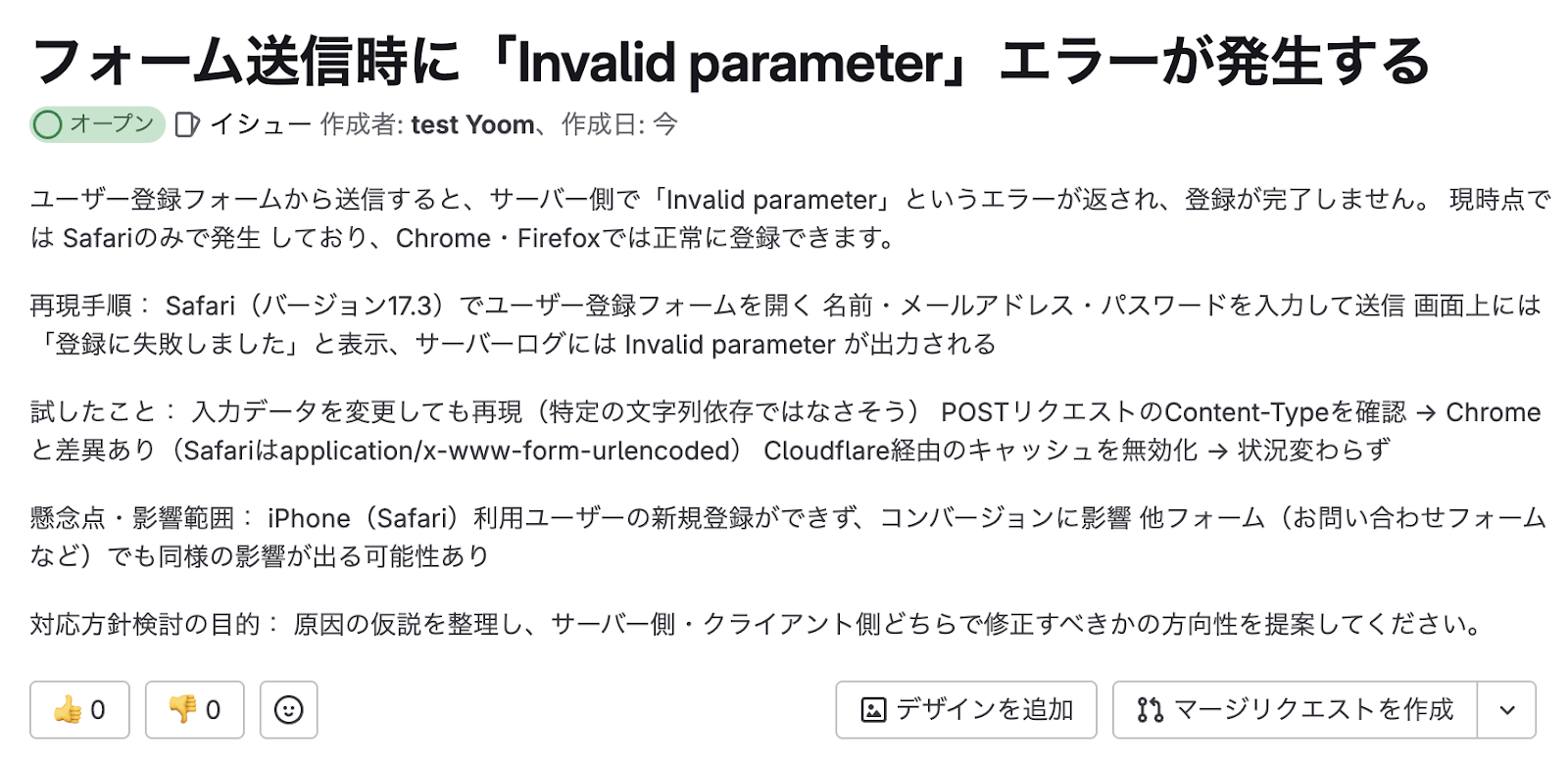 事前準備としてGitLabでイシューを作成しておきましょう。 今回はテスト用に、以下の内容で作成しました。 この作成したイシューがトリガーイベントとなり、自動化の起点となります。