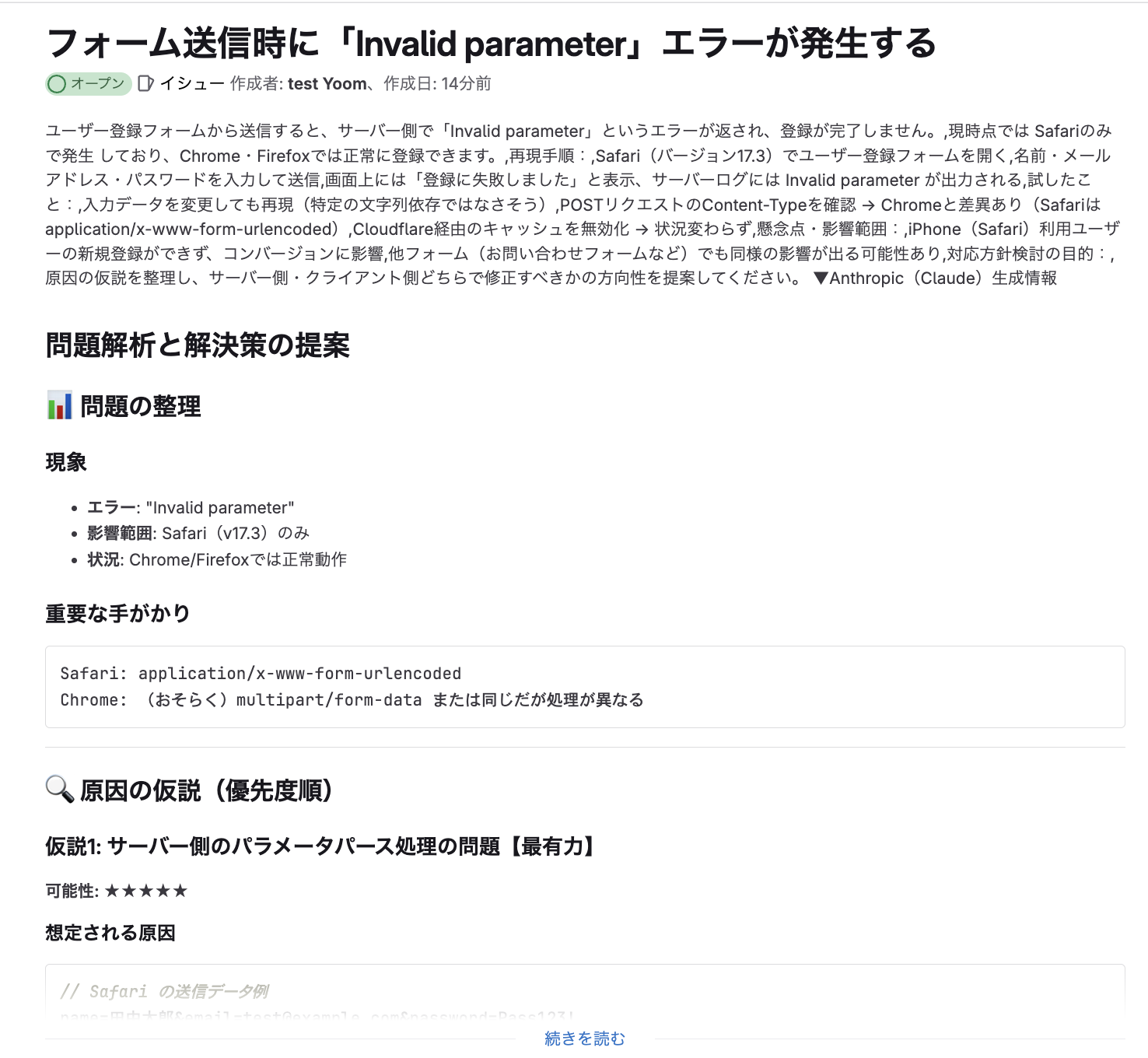 これにより、開発チームはイシューが起票された直後からAIによる客観的な分析結果を元に議論を開始でき、対応の迅速化と質の向上に繋がります!