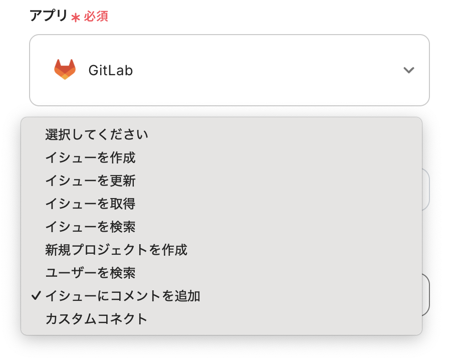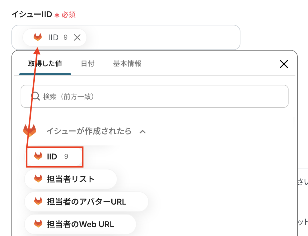 イシューIID 入力欄をクリックすると、前のステップでGitLabから取得した値が表示されるので、選択して入力しましょう。