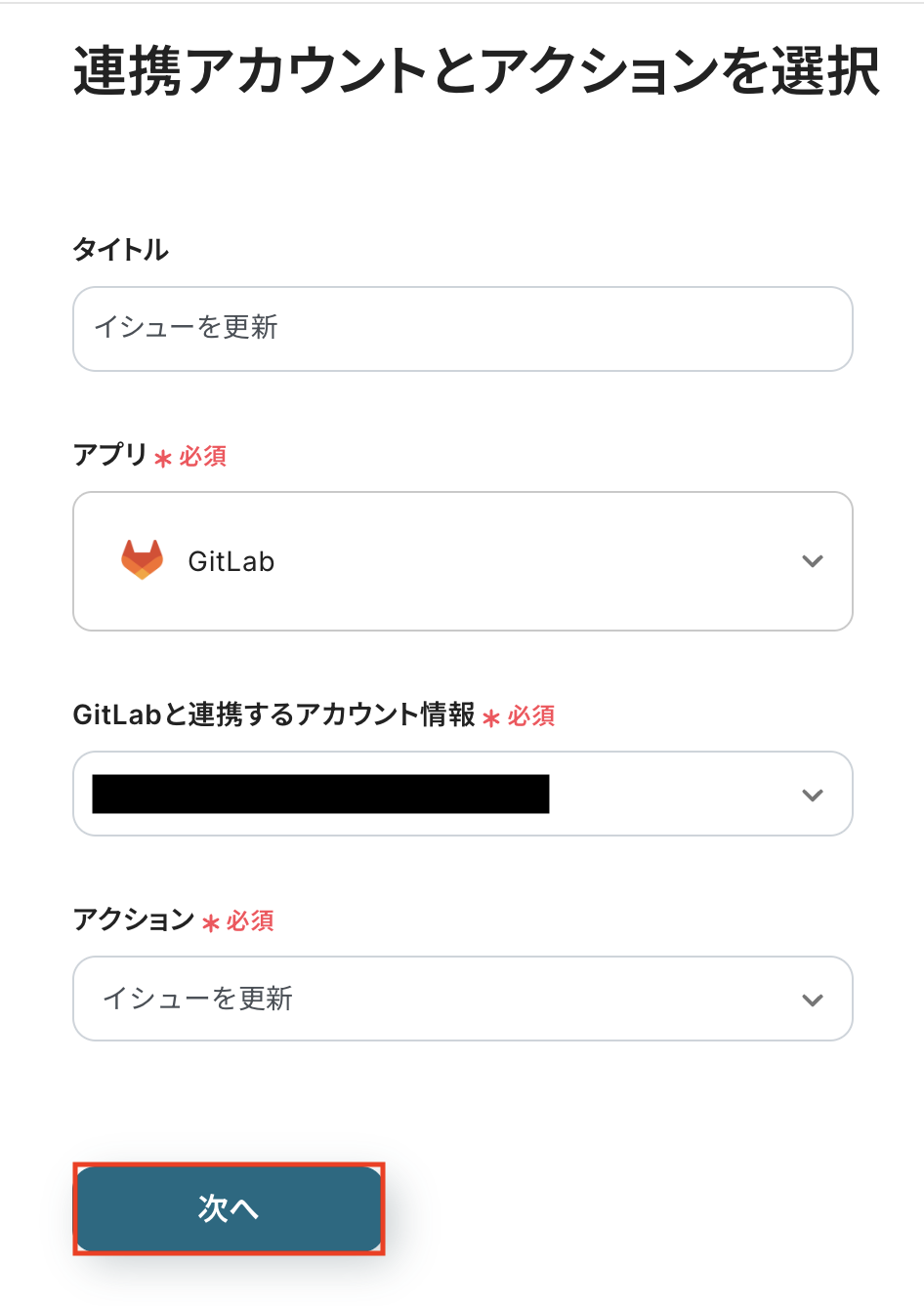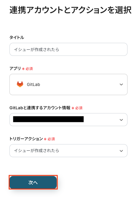GitLabと連携するアカウント情報に問題がなければ、「次へ」をクリックします。