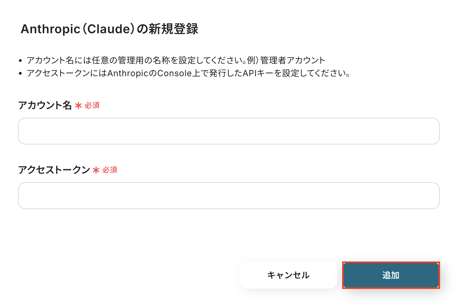 以下の画面が表示されるので、アカウント名とアクセストークンを注釈に沿って入力し、「追加」をクリックしましょう。