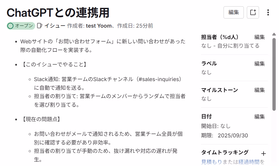 もし、<span class="mark-yellow">GitLabに新しいイシューが作成されたタイミングで、その内容を自動的にChatGPTが解析し、要約やネクストアクションをイシューに追記してくれる仕組み</span>があれば、開発チームはより迅速かつ正確にタスクに取り掛かることができ、本来注力すべきコーディングやレビューといったコア業務に集中できる時間を生み出せます。
