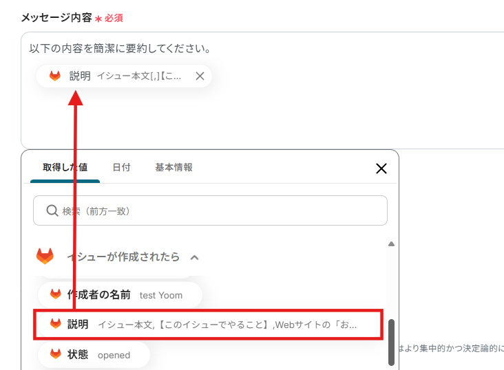 メッセージ本文にはGitLabから取得した値を用いて「説明」を入力しましょう。