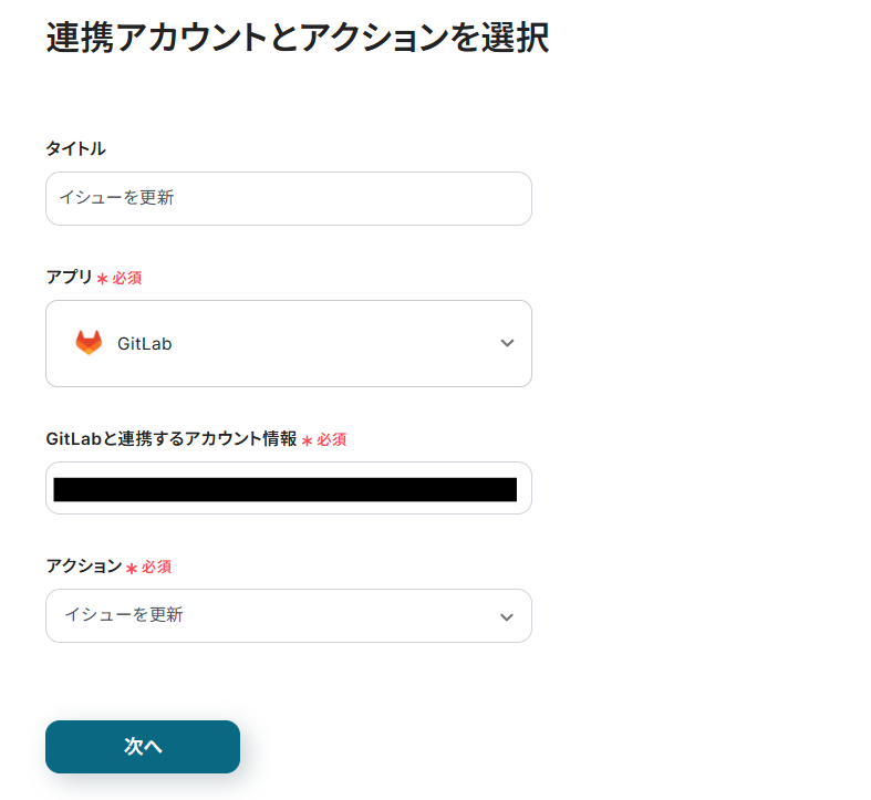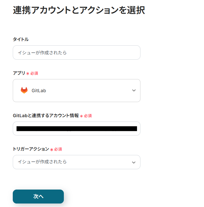 連携アカウントとアクションを選択する画面が表示されるので、今回連携するGitLabのアカウントを確認し「次へ」をクリックします。