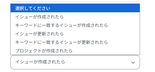 イシューの作成以外にも「イシューの更新」や「プロジェクトが作成されたら」など以下の画像のアクションをトリガーにすることができます。