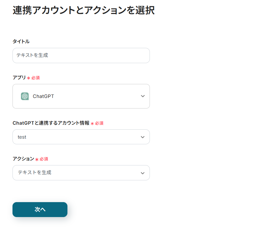 連携アカウントとアクションを選択する画面が表示されるので、今回連携するChatGPTのアカウントを確認し「次へ」をクリックします。