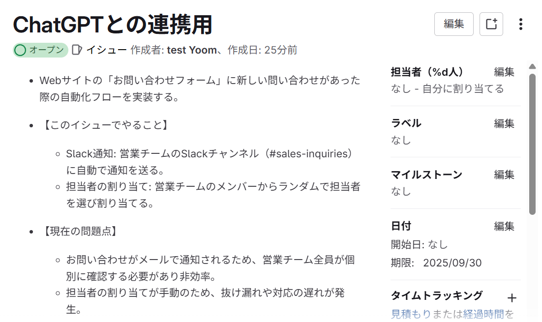 もし、GitLabに新しいイシューが作成されたタイミングで、その内容を自動的にChatGPTが解析し、要約やネクストアクションをイシューに追記してくれる仕組みがあれば、開発チームはより迅速かつ正確にタスクに取り掛かることができ、本来注力すべきコーディングやレビューといったコア業務に集中できる時間を生み出せます。
