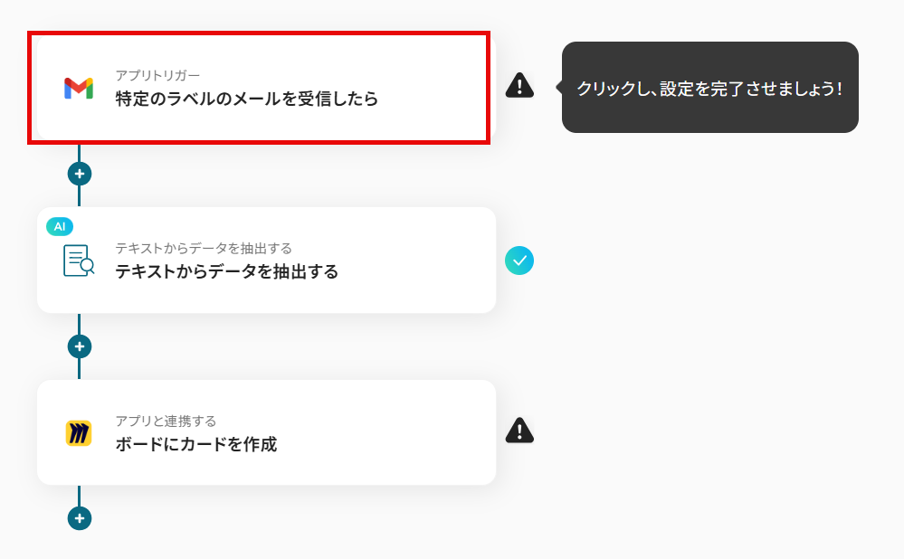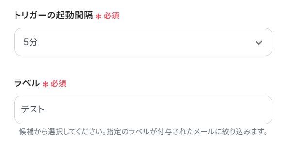 - トリガーアクション:Gmailで特定のラベルのメールを受信したら起動します。