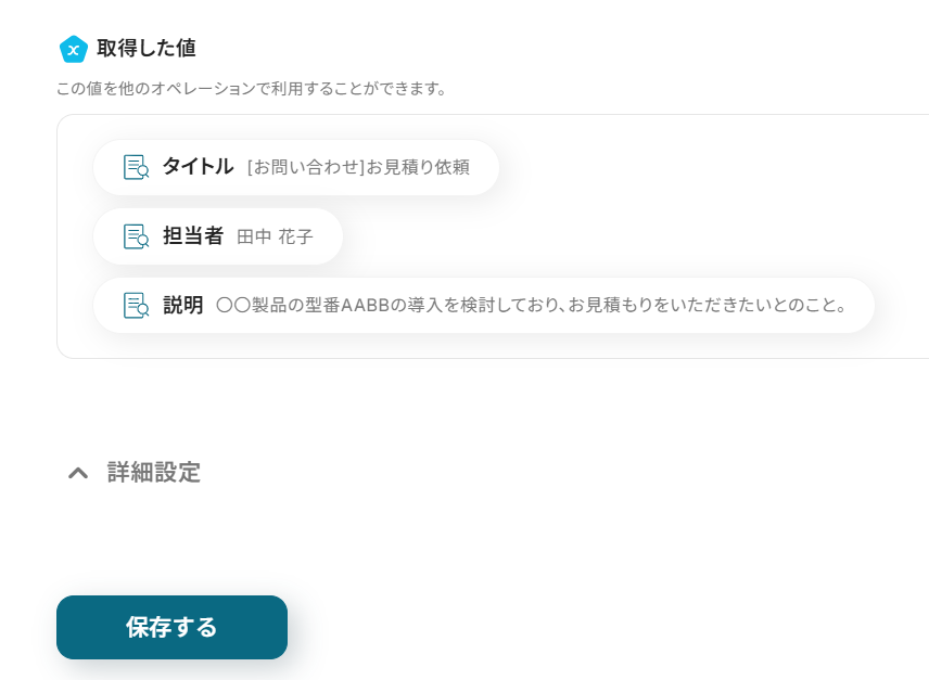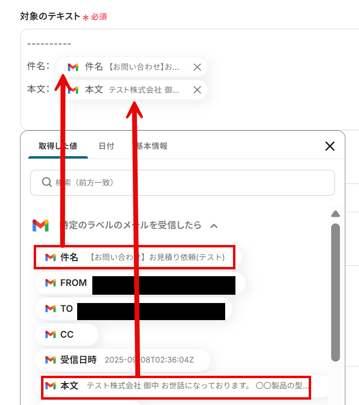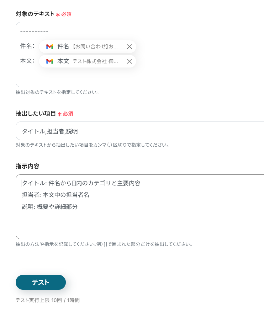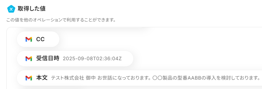 テストに成功すると以下のように表示され、Gmailから取得した情報を活用できるようになります。