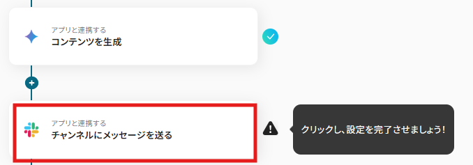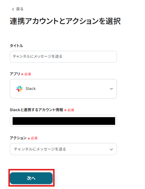 こちらもタイトルは任意で変更できます。Slackと連携するアカウント情報を確認し、トリガーアクションは「チャンネルにメッセージを送る」のままで「次へ」をクリックします。