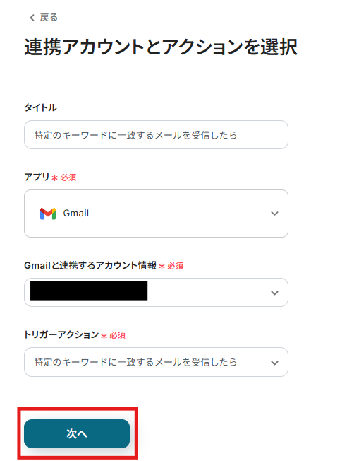 Gmailと連携するアカウント情報を確認し、トリガーアクションは「特定のキーワードに一致するメールを受信したら」のままで「次へ」をクリックします。